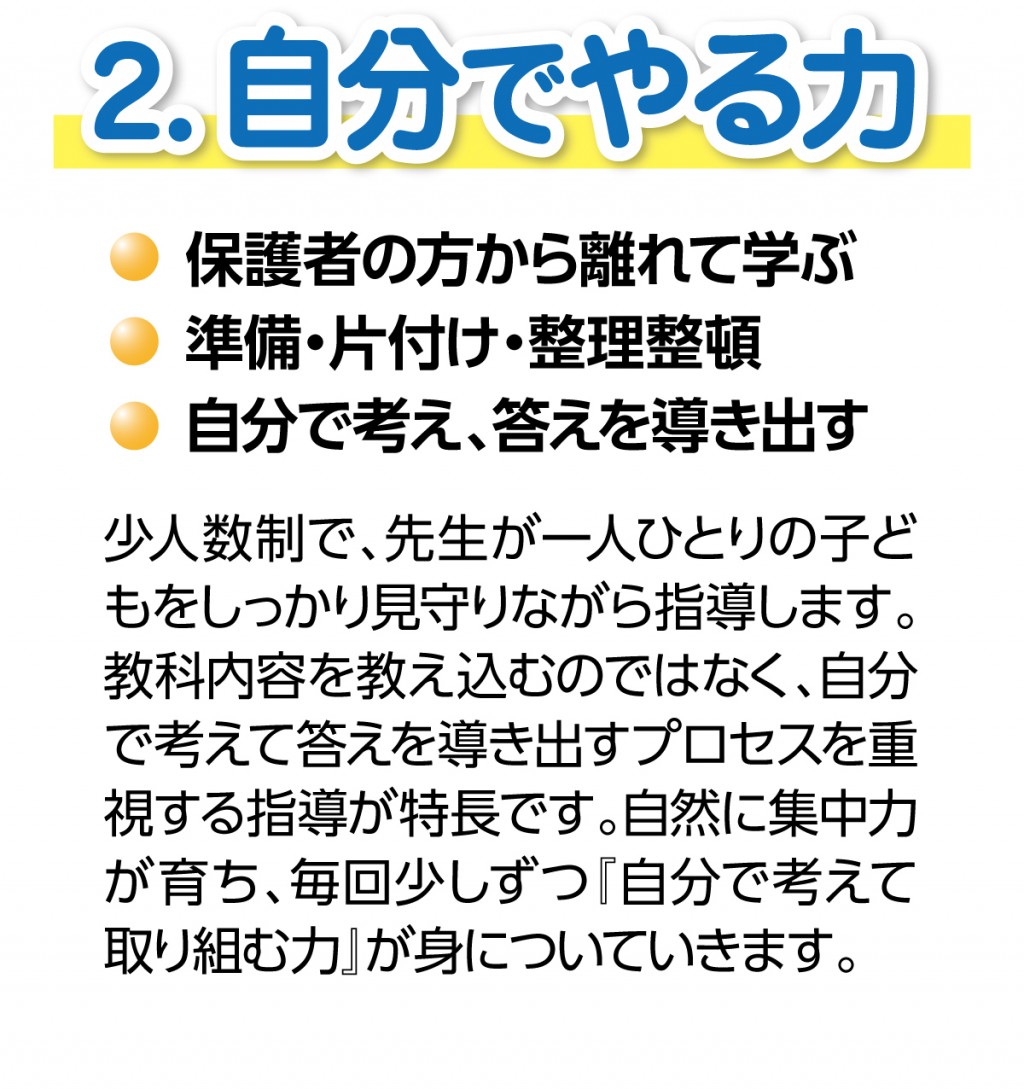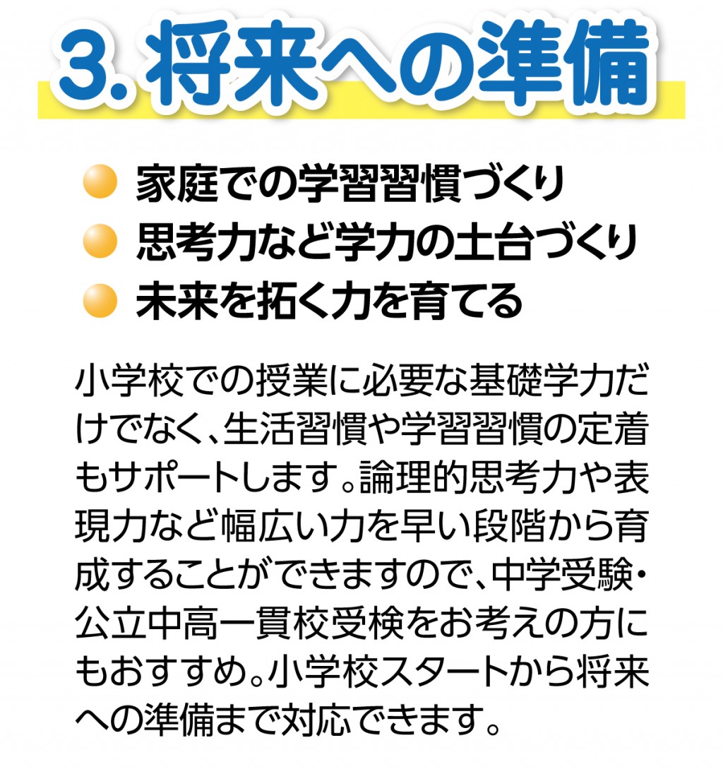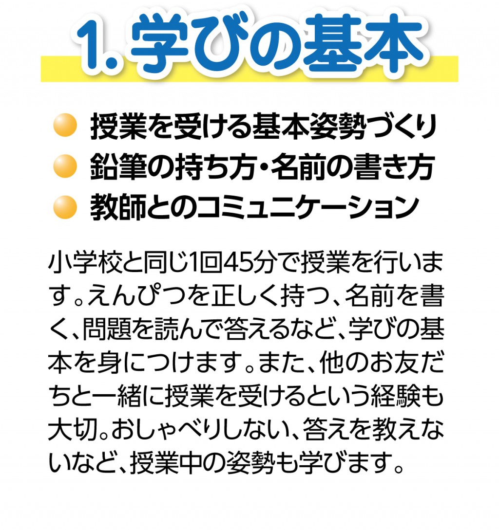 小学校の授業時間は45分。45分間しっかり授業を受けるというのは、はじめのうちはとても大変なこと。CG中萬学院・啓明館の「新小1入学準備講座」では、ご入学前に身につけておきたい『学びの基本」を学べるプログラムをご用意しています。