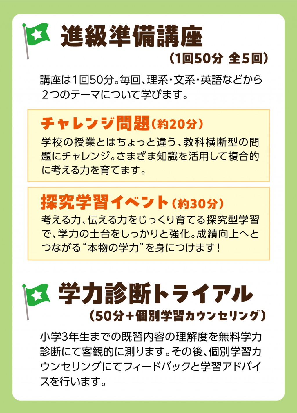 | 日程 | 3月22日(土)まで開講 1回50分の進学準備講座(全5回)+学力診断トライアル(50分) |