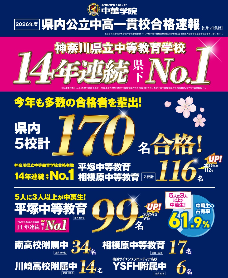 CG中萬学院では、横浜市立南高校附属中・横浜市立横浜サイエンスフロンティア高校附属中、川崎市立川崎高校附属中、県立相模原中等教育・県立平塚中等教育受検を目指す小5生・小6生を対象とした公立中高一貫校対策模試を随時実施しております。適性検査対策の学習指針に公立中高一貫校対策模試をご活用ください。