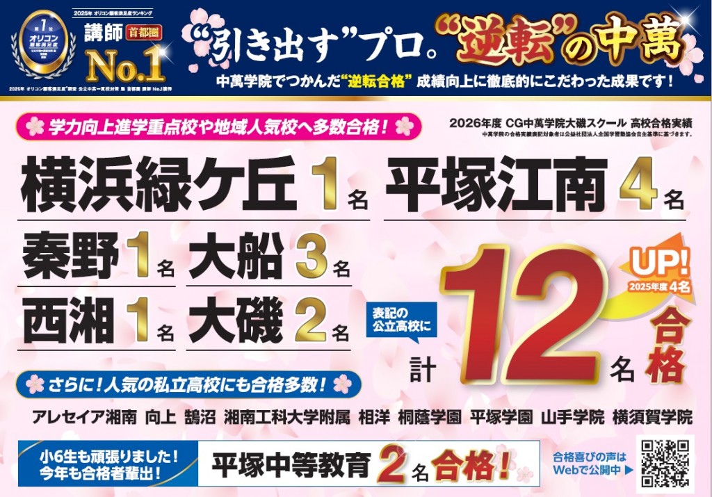CG中萬学院大磯スクールは、高校受験を目指す小4~中3生、公立中高一貫校受検を目指す小4~小6生対象の集団指導の塾です。