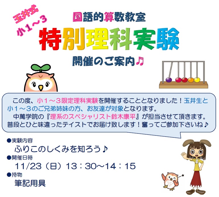 また、小1から小3対象の公立中高一貫校受験対策「玉井式国語的算数教室」、小1~小6対象のプログラミング講座「プロクラ」も開講中です。