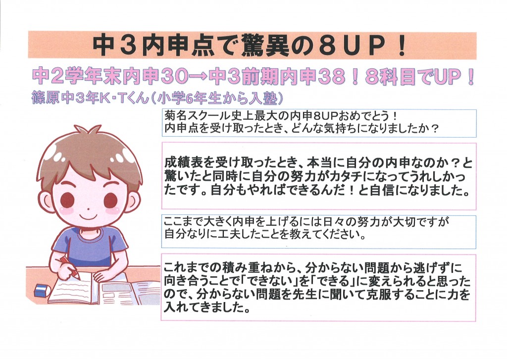 中2の2学期から入塾し、中3の11月までで内申12UP!