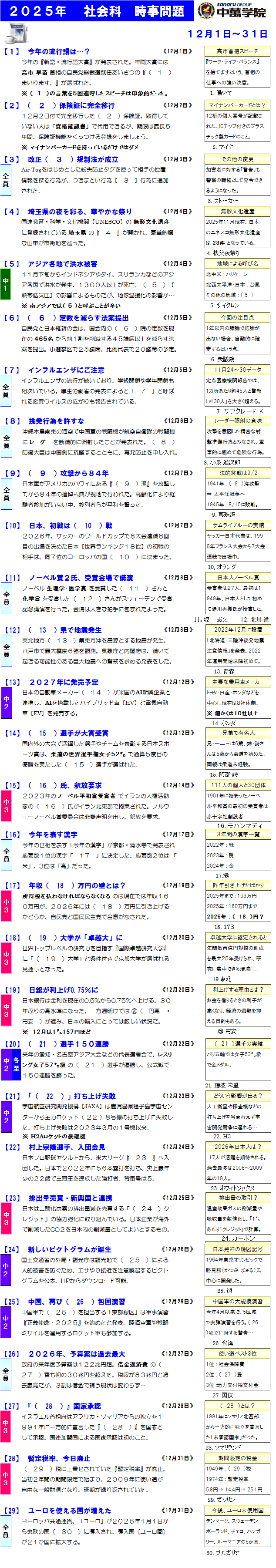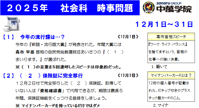 【数学・理科・社会】:学校ではその学年の習ったところが基本です。一方で入試は数学では計算・関数・図形・確率、理科では光音力・大地、社会なら地理・歴史と中1・中2分野が入ってきます。