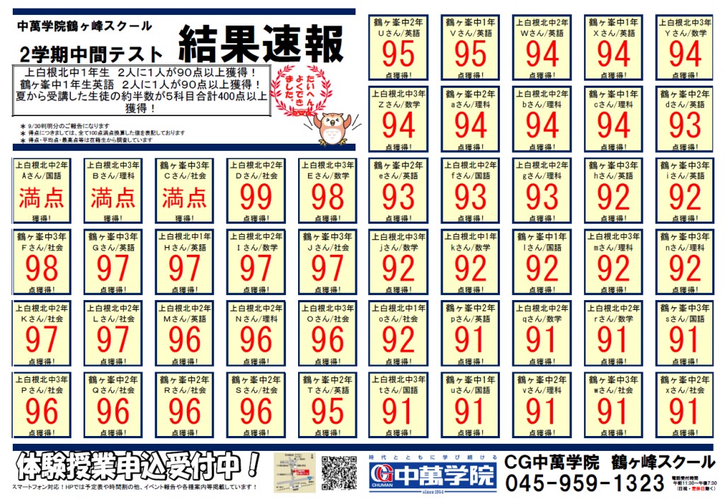 今年も定期テストで鶴ヶ峰スクール生大活躍!